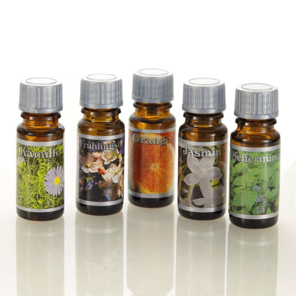 Fünf ätherische Öle in verschiedenen Geschmacksrichtungen
